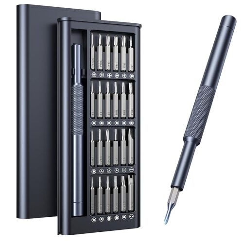 The set includes 24 interchangeable mini bits, clearly labeled for quick selection, housed in a compact, portable case. Whether you’re fixing a smartphone or maintaining a drone, this kit delivers precise control every time.
