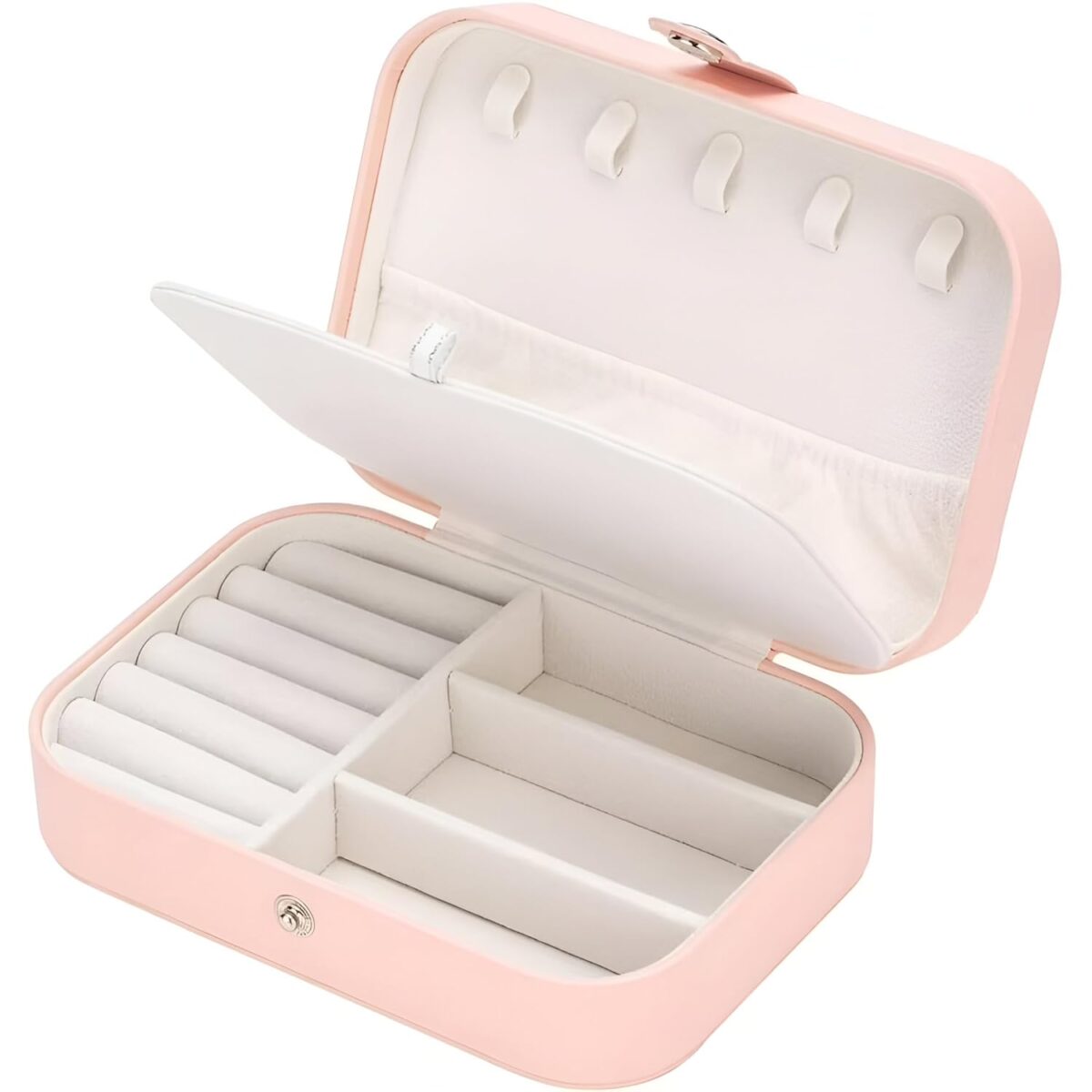 Keep your accessories safe and stylishly organized with the “BIG Jewelry Leather Box”. This elegant jewelry organizer features a compact pink PU leather exterior and a soft white interior lining that protects your valuables from scratches and dust. Designed with multiple compartments, it offers dedicated spaces for rings, earrings, necklaces, and other small treasures, keeping everything in place and easy to find.