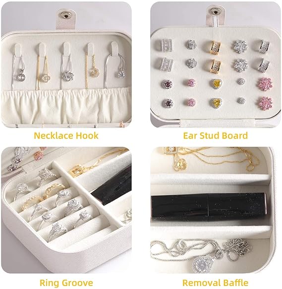Its multi-layer design includes ring rolls, earring slots, and necklace hooks to maximize storage efficiency without taking up much space. The sturdy snap-button closure ensures your items stay securely stored, whether at home or on the go.