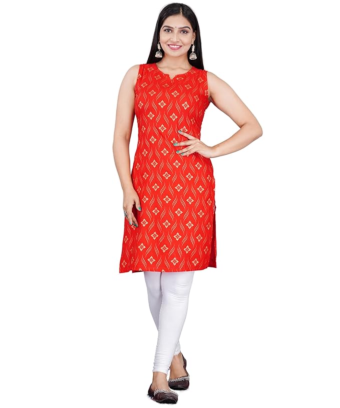 - Jaipuri Printed Rayon Straight Kurti for Women – Red Gold Flower