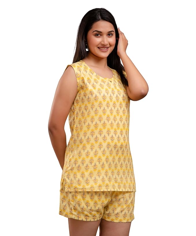 Proudly made in India, this nightwear set is crafted by expert artisans who use authentic Jaipuri printing techniques and premium cotton to ensure durability and lasting freshness. Perfect for nightwear, loungewear, summer wear, or casual outings, this Yellow Cotton Top & Shorts Set is the ideal choice for women who love comfort, color, and effortless everyday style.