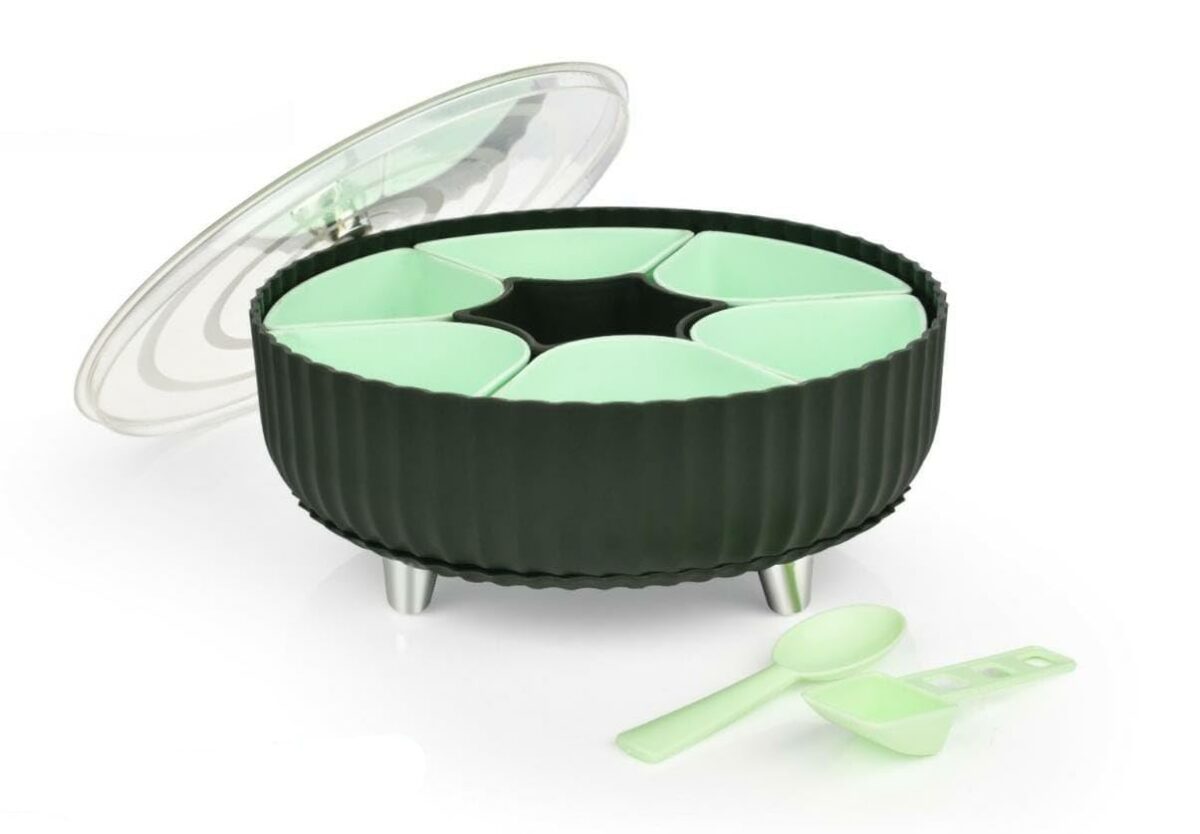 Upgrade your kitchen with this stylish and functional Revolving Masala Box, designed to hold up to 6 different spices or condiments in individual compartments. The space-saving rotating carousel offers easy access from any angle, making meal prep more efficient and organized.
