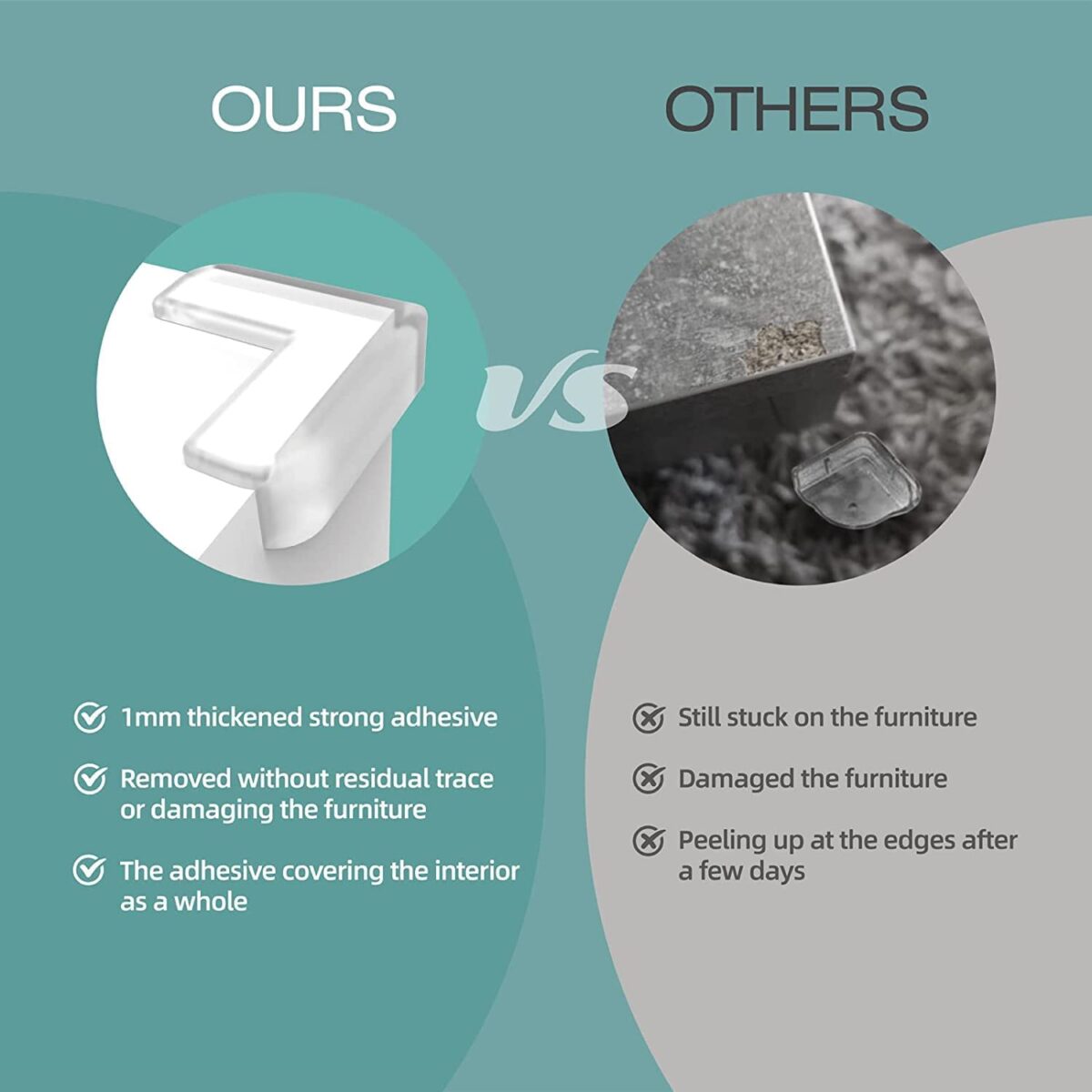 Our protectors come with dual-sided high-power adhesive for fast, no-hassle installation in under a minute. When no longer needed, they remove cleanly without damaging furniture. Unlike bulky foam options, these crystal-clear bumpers won’t discolor or ruin your home’s aesthetic. A must-have for stress-free babyproofing.