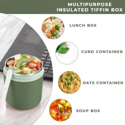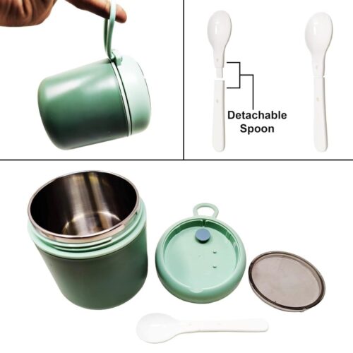 This insulated food jar comes with a built-in foldable spoon neatly stored in the lid, making it easier to eat anytime, anywhere. The leak-proof lid design ensures secure storage and zero spills inside bags or lunch totes.